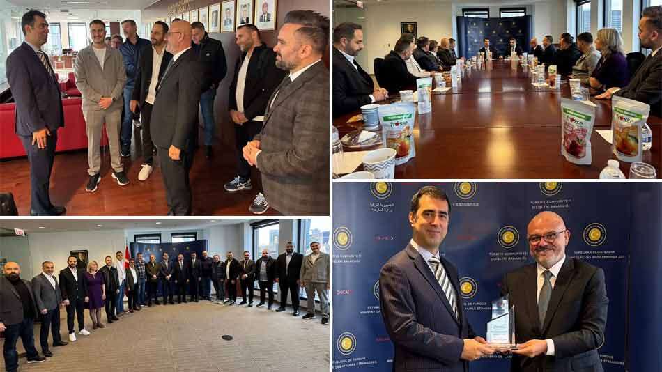"ABD’de İhracatı arttırmaya yönelik çalışmalarımızı sürdürürken; Chicago Konsolosumuz Sn. Engin Türesin ve Ticaret Ateşemiz Sn. Ahmet Samet Tekoğlu’nu heyetimizle birlikte bir görüşme gerçekleştirdik. Konsolosumuza ve Ateşemize misafirperverliklerinden dolayı teşekkür ederiz."